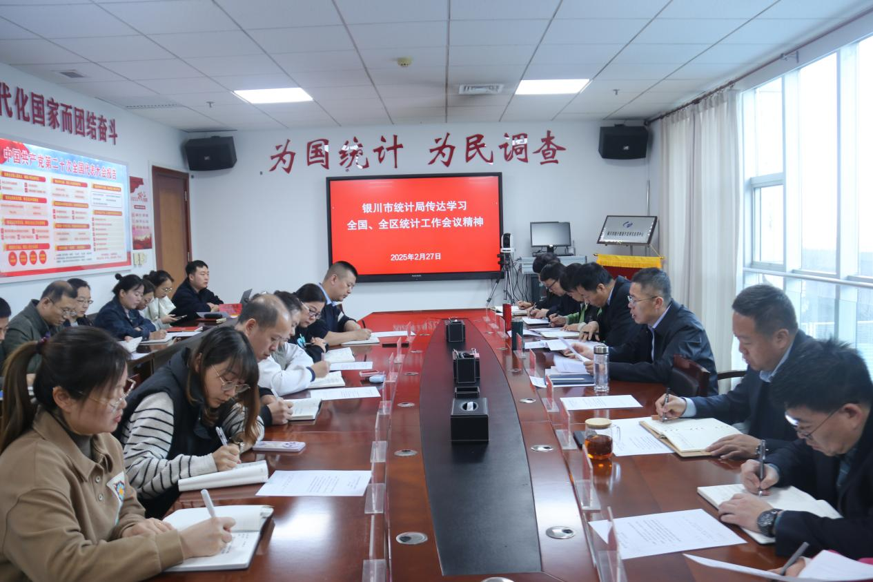 会议强调,2025年是“十四五”规划收官之年,是落实进一步全面深化改革起步之年,也是纵深推进“五八”强首府战略的关键之年。全市统计系统要深入学习领会全国、全区统计工作会议精神,坚决贯彻落实会议各项决策部署,全力以赴干好2025年各项重点工作,奋力书写统计现代化改革银川新篇章。一是锚定发展目标,把握正确方向。准确把握会议精神和部署要求,把学习宣传贯彻好全国、全区统计工作会议精神作为当前一项重要任务,结合学习贯彻习近平总书记考察宁夏重要讲话、对统计工作重要讲话和重要指示批示精神以及全市“新春第一会”精神,全面理解、整体把握、一体落实,全力推进会议各项决策部署在统计部门落地生根。二是细化责任分工,狠抓工作落实。结合我市统计工作实际,主动认领任务,将会议提出的各项工作细化分解到具体科室,扎实做好“五经普”资料开发应用,精心组织1%人口抽样调查,重点做好GDP历史数据修订、投入产出核算等工作,高质量推进各专业领域统计改革任务落地落实。三是聚焦监测分析,提升服务效能。紧紧围绕市委、市政府“3837”工作思路,聚焦经济社会发展中的重点、难点、热点问题,深入开展调查研究,加强对数据背后影响因素的分析,及时准确反映经济运行态势,充分发挥统计数据“晴雨表”作用,为党委政府科学决策提供高质量的统计服务。四是抓实督察整改,强化法治建设。扎实做好国家统计督察反馈意见整改。提高政治站位,坚决落实统计督察整改政治责任,严格对标对表,制定整改方案和工作台账,全面抓好督察整改任务落实,强化责任担当,不断巩固统计督察整改成效,切实肩负防治统计造假责任。厚植统计法治理念,以学习宣传贯彻新修改《统计法》为契机,加大统计法律法规宣传力度,提高全社会统计法治意识;持续推进统计执法检查,严肃查处统计违法行为,全力营造风清气正的统计环境,开创依法统计依法治统新局面。五是锻造过硬队伍,夯实发展支撑。坚持实干争先、善作善成,紧扣市委“四强”能力作风巩固年活动,大力弘扬求实务实落实真实工作作风,通过“统计业务讲堂”、“青年理论学习小组”等活动,不断提升业务能力和综合素质,着力打造一支政治坚定、业务精通、作风过硬的干部队伍。